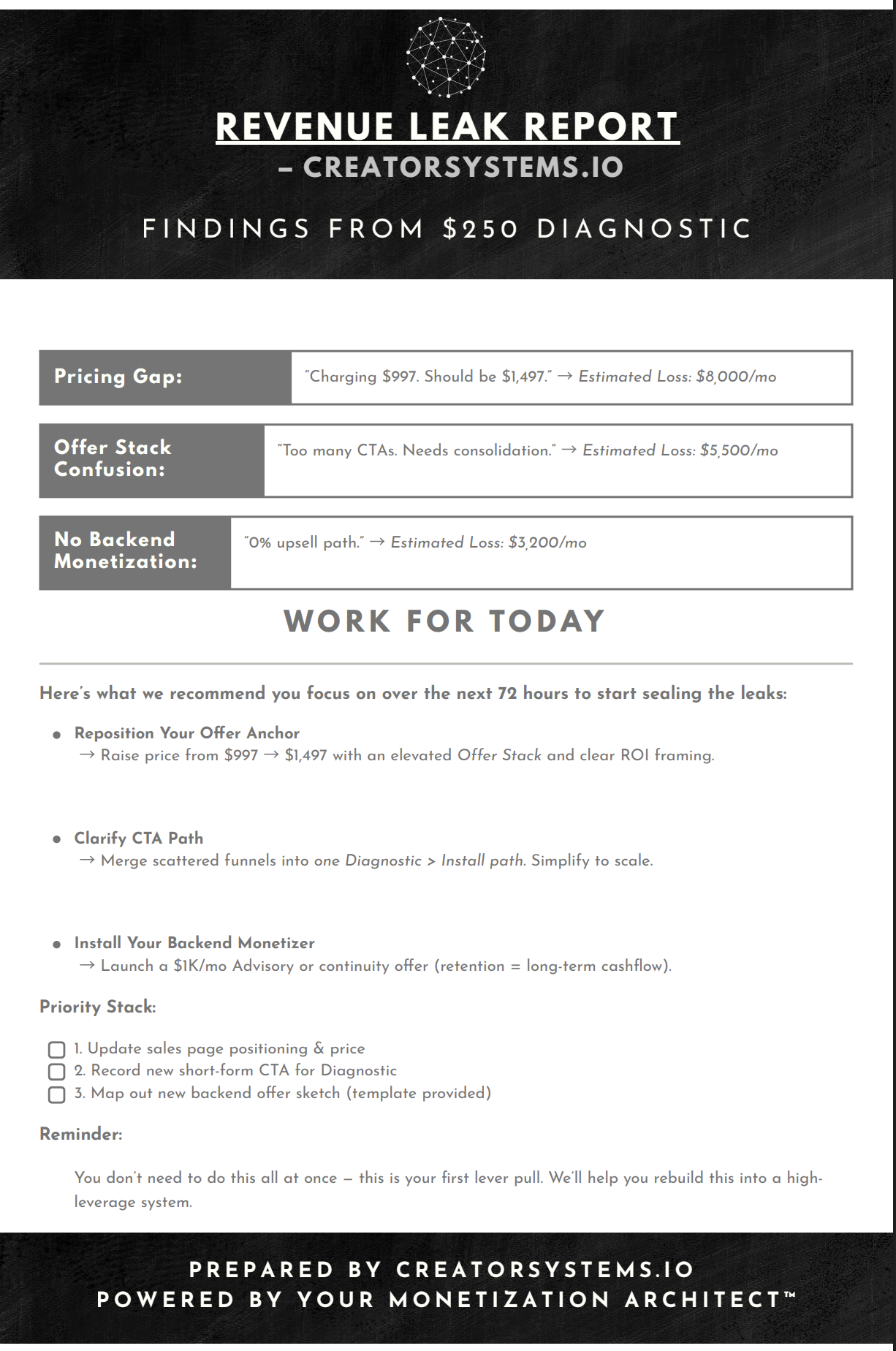A custom Monetization Map™ (revenue leaks + upgrade paths)